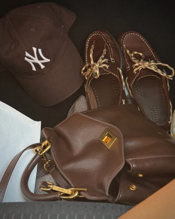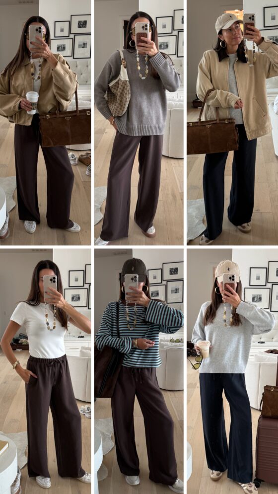 My airport travel day outfit was full of my new must haves for fall!  This striped rugby polo shirt with a basic tee and wide leg sweatpants was comfy and perfect for travel. I recently got this brown suede bucket bag and its such a great find – a great designer look for less. Full outfit linked here.