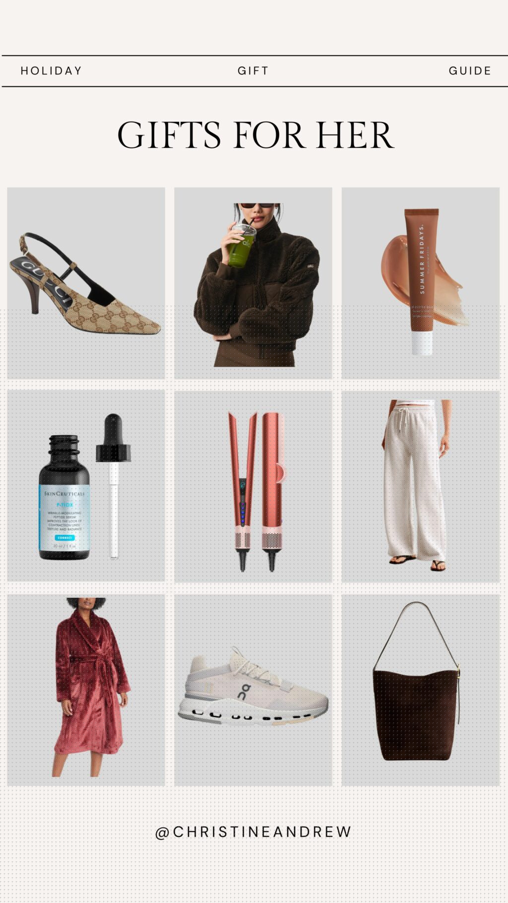 GIFTS FOR HER: gucci heels // alo sherpa jacket // summer fridays lip balm // skinceuticals p-tiox // dyson airstrait // favorite sweatpants // softest robe // oncloud sneakers // suede bucket bag